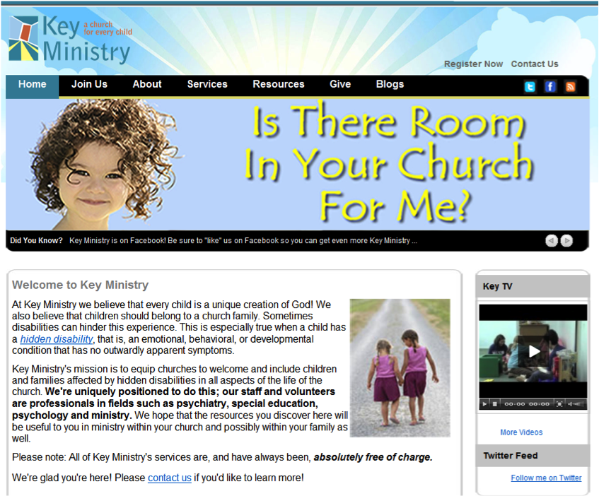 Our team at Key Ministry has been tirelessly working to develop web-based resources and user-friendly social media to advance the cause of connecting families of kids with hidden disabilities to churches. We have a new website, two blogs, a Facebook page, my Twitter feed and an “official” Key Ministry Twitter feed maintained by Rebecca Hamilton, our Executive Director. Since research has suggested that too much time spent staring at a computer screen can contribute to ADHD, I thought I’d share some suggestions to help friends new to Key Ministry quickly find the most relevant content based upon their experiences and interests.