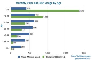 Any parent of a teenager or anyone close to a teenager can tell you that most kids rely heavily upon electronic communication these days, either by cell phone or computer. The chart below demonstrates statistics examining cell phone usage and texting by age.  Click this link to an article discussing the data in greater detail.