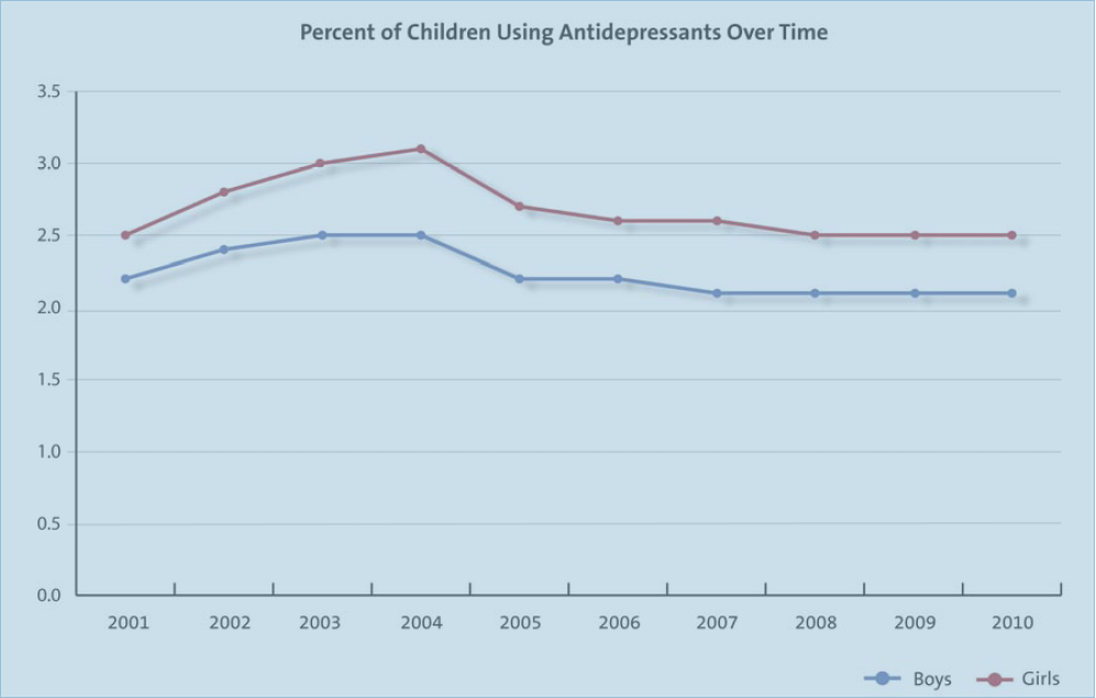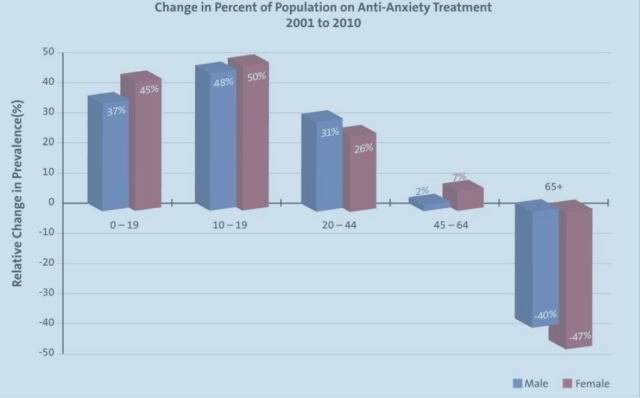 The rate of increase in anti-anxiety medication use was greatest among kids in the 10-19 age group…possibly related to the decrease in the use of antidepressants to treat anxiety because of the FDA warnings.