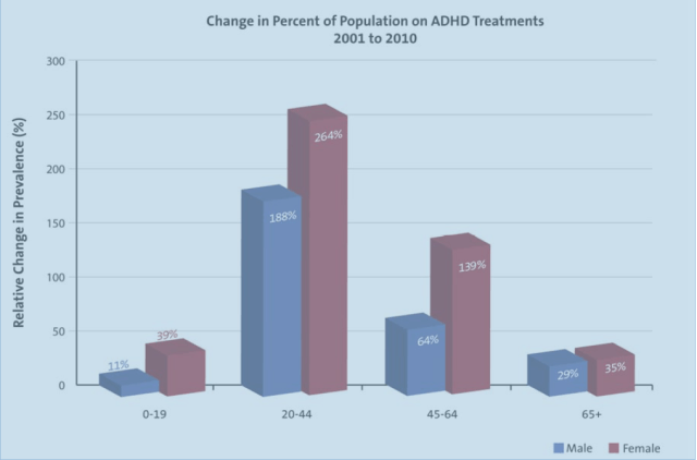 The percentage of girls taking medication for ADHD is increasing nearly four times as quickly as the percentage of boys on medication. Most notable over the past ten years is the rate of increase in use of ADHD medication among adults. More women than men take medication for ADHD (the reverse of the situation in childhood).