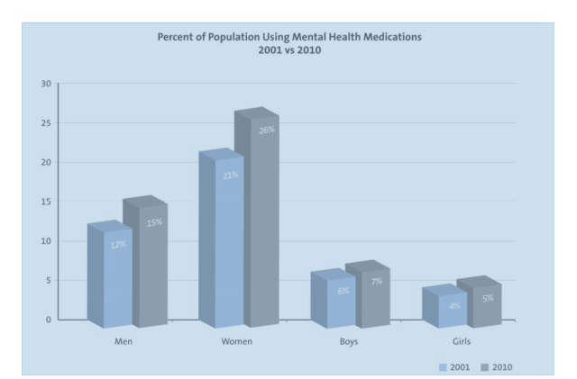 More than one in five adult residents of the U.S. currently take medication for a mental health disorder, including more than one in four women. More boys than girls are on medication, but the rate of increase in the use of medication is greater in girls than boys.