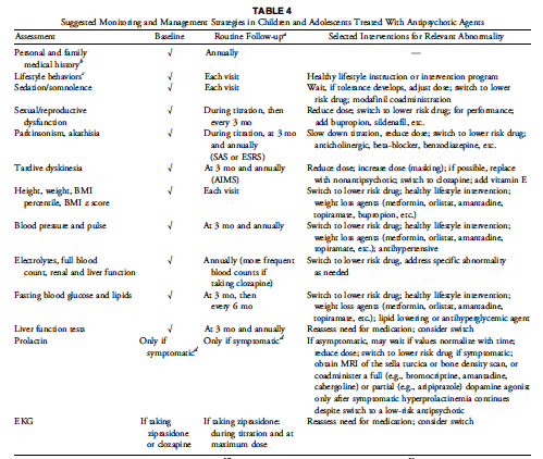 My frustration is that I see kids all the time who’ve been referred to our practice with a history of having been treated with antipsychotics coming in with parents who have little idea as to why their child is/was taking the medication prescribed, little understanding of the possible side effects associated with the medication and lacking the required monitoring for side effects while taking the medication. (from Correll, CU, J. Am. Acad. Child Adolesc. Psychiatry 2008; 47(1) 9-20.)