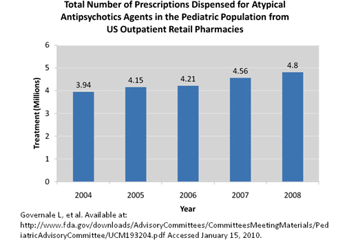 prescription for an antipsychotic. Since Dr. Olfson’s study, the absolute number of prescriptions written for antipsychotics in kids has increased every year, to 4.8 million per year for children in the U.S.