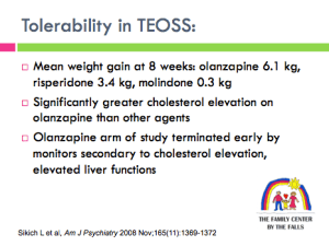 It’s important to acknowledge that the data presented here is derived from a short-term study, and it’s difficult to interpolate long-term risks from a short term study. But data from another short-term study, the Treatment of Early-Onset Schizophrenia (TEOSS) study produced similar results. The NIMH-funded controlled study compared tolerability and efficacy of olanzapine, risperidone and molindone in patients ages 8-19. The study monitors suspended the olanzapine portion of the study because of changes in liver function and the severity of cholesterol elevation noted in kids randomized to that medication.