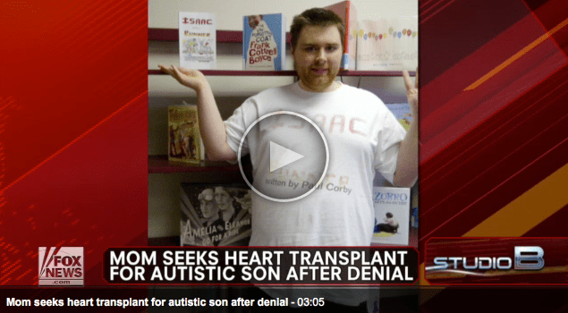 Many who know me are aware that I’m very troubled by trends I’ve observed in medical ethics as applied to persons with disabilities. This past week, we learned of Paul Corby, a 23 year old man with autism who was denied access to the heart transplant list at the University of Pennsylvania primarily because of his autism. If you click on the picture below (sorry, couldn’t embed the video), you can see a news report on Paul’s situation. Paul’s family has launched an online petition with over 240,000 signatures to the U.S. Senate in an effort to get him a transplant, and plans to seek second opinions at the Mayo Clinic and the University of Pittsburgh.