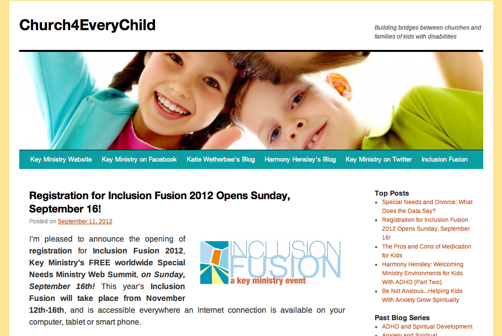 Thanks to our readers for your support, comments and interest in Church4EveryChild in 2012! This blog, together with Katie Wetherbee’s and Harmony Hensley’s blog and our Key Ministry website represent our main tools for getting the word out about all of the free products, services and events we provide for churches seeking to welcome, serve and include kids with disabilities and their families.