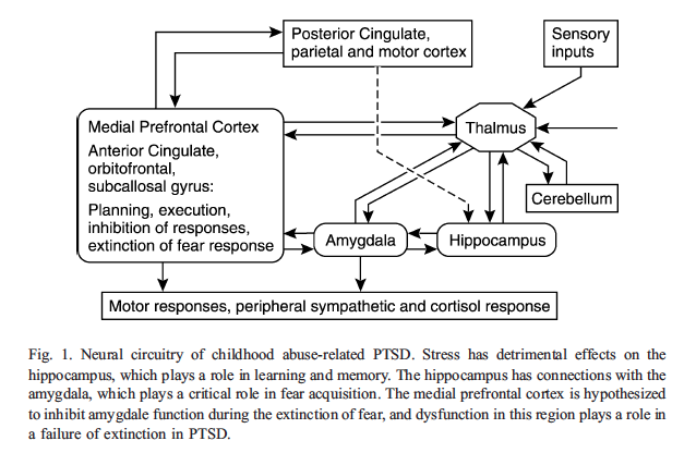 Here’s a diagram from an article in Child and Adolescent Psychiatric Clinics of North America that shows the interrelationship of the different neural circuits involved in childhood PTSD…