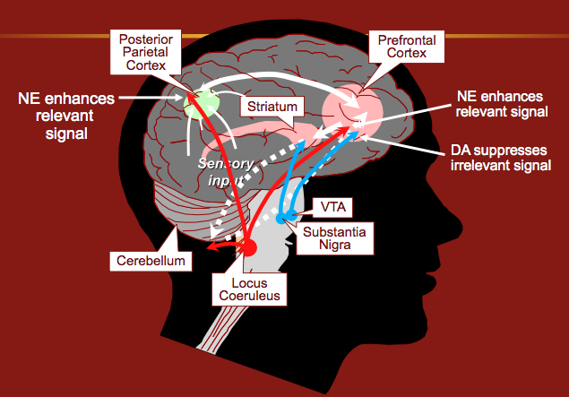 The noradrenergic system (along with the dopaminergic system) is the primary system associated with executive functioning. Tracts of neurons originating in the locus coeruleus project to the posterior attention center in the parietal cortex (responsible for scanning the environment for relevant stimuli) and the anterior fronto-striatal system, which is more involved with executive control and focusing attention. The posterior center is primarily under noradrenergic control, while the anterior center receives both dopaminergic and noradrenergic projections. Difficulties associated with weaknesses in executive functioning include poor impulse control, diminished capacity for emotional self-regulation, delaying gratification and problems with working memory. Editor’s note: This may help to explain the increased prevalence of ADHD among kids who have been traumatized or abused along with the observation they are frequently less responsive to medication than kids with ADHD lacking such exposure.