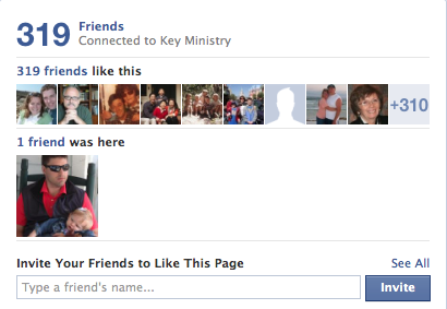 Just below the heading in the right hand column, you’ll see a box indicating how many of your friends also “like” Key Ministry and a box that says “Invite Your Friends to Like This” (demonstrated in the image at right)