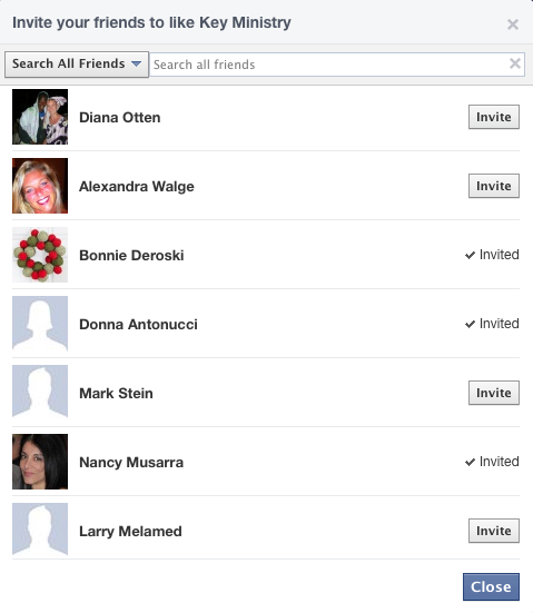 A list will appear on the screen of all your Facebook friends. You can then page down through your list of friends and click the “Invite” button next to the name of friends who might be interested in Key Ministry’s mission or resources. Editor’s note…I’ve already invited most of my friends…that’s why a number of these names are marked “invited” in the picture. Hit the blue “Close” button on the bottom right when you’ve completed the task.