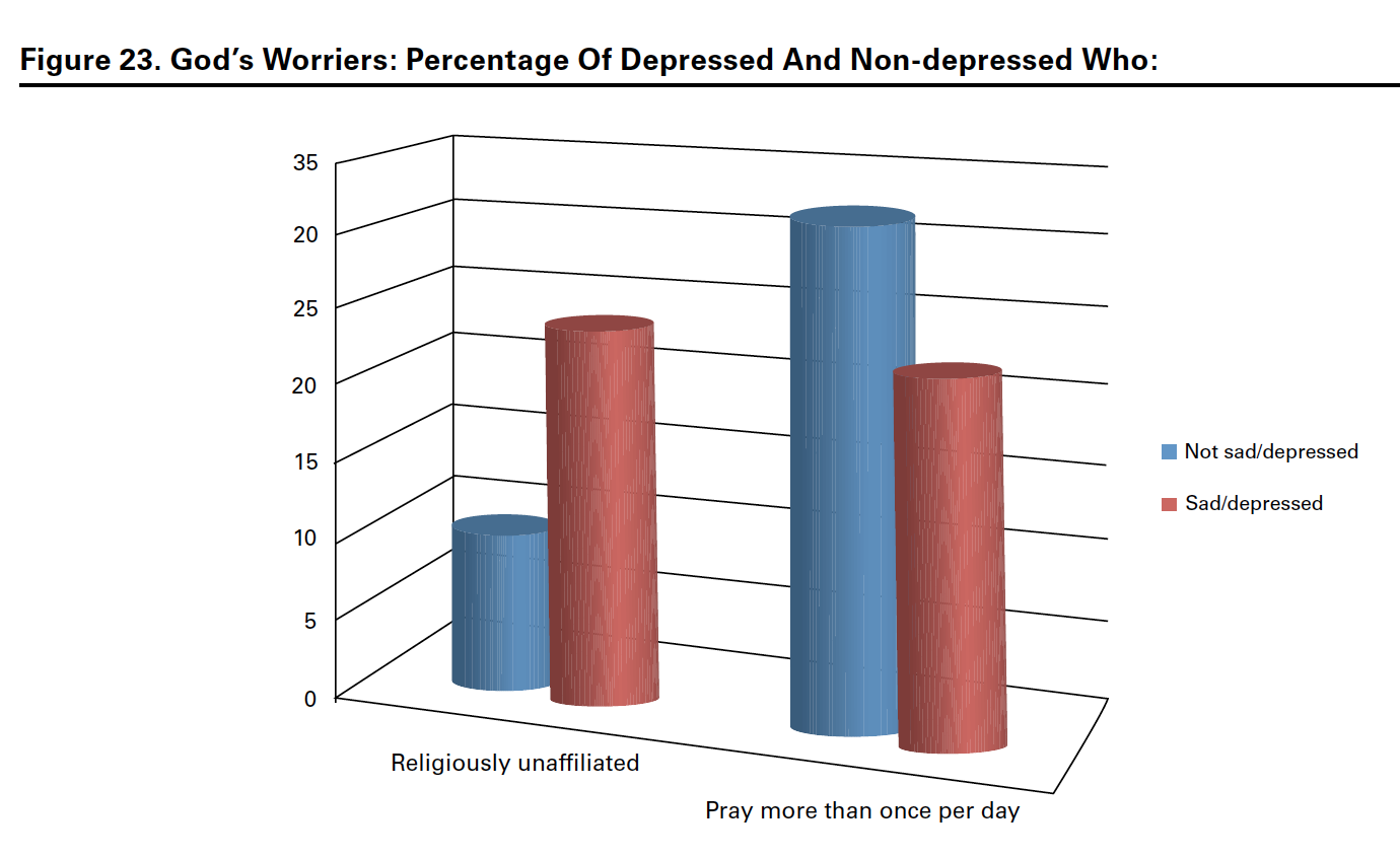 - 23% of “depressed” respondents pray more than once daily vs. 32% of the non-depressed.