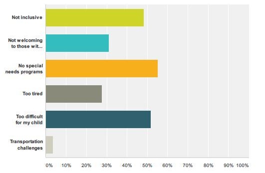 - The greatest barriers to local church attendance were not having a special needs program at their church (55%); too difficult for my child (51%); not inclusive (48%); not welcoming to those with special needs (30%); too tired (28%); transportation challenges (3%).