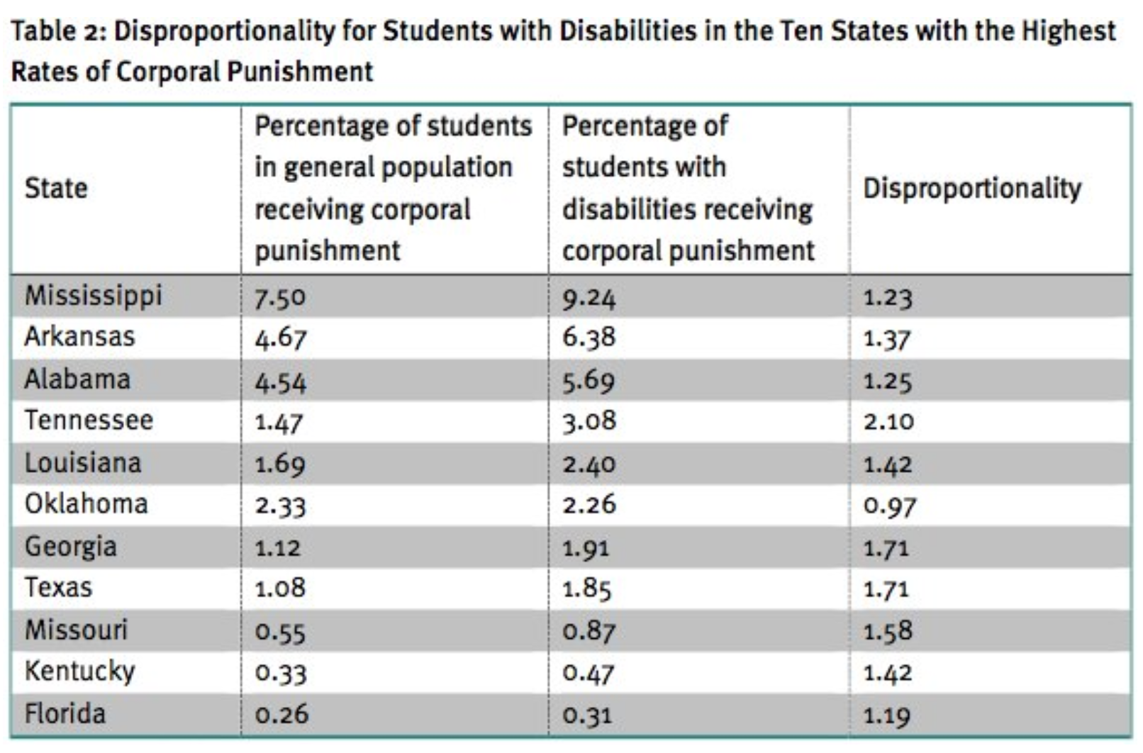 Corporal punishment is still permitted in public schools in nineteen U.S. states. Data collected by the U.S. Department of Education suggests that kids with disabilities are significantly more likely to experience corporal punishment in school when compared with “typical” peers…