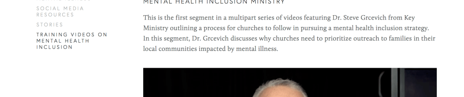 To access the video series, simply click this link to the page on our website where the videos are housed. In addition to the training videos, we also have made available an informational page on the book, recommended books and resources for mental health inclusion, a guide to other mental health ministry organizations, research pertaining to mental illness and church involvement, sermons in which the topic of mental illness is addressed, helpful social media resources and stories from individuals and families about their experiences of attending church with a mental health condition.