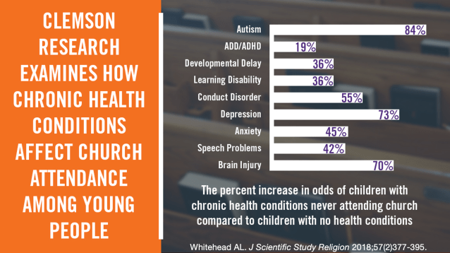 Many of my friends in disability ministry have seen this slide, but it demonstrates the impact of common mental and developmental disabilities in children on family church attendance.